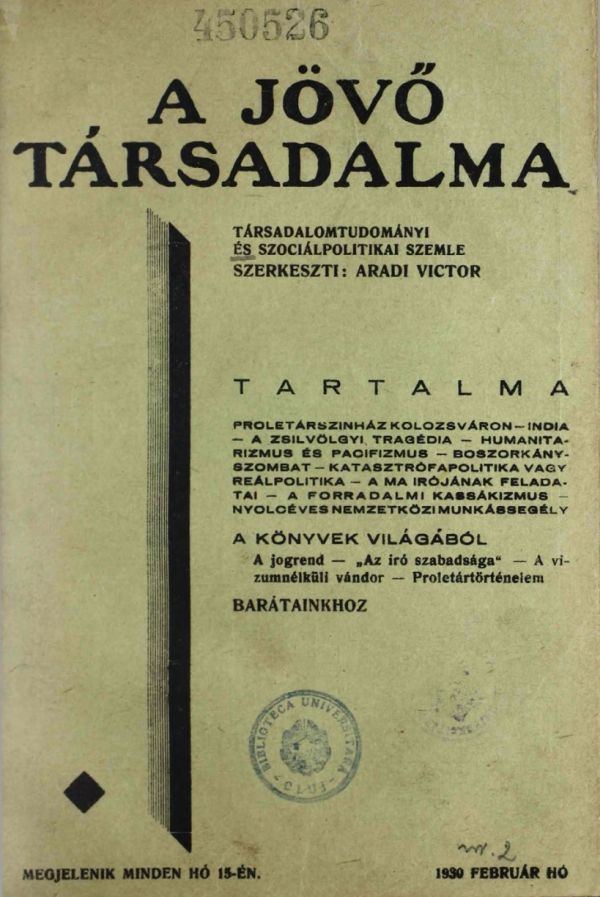 1925 szeptemberében indult Kolozsvárt "Társadalomtudományi és szociálpolitikai szemle"; alcímmel, Aradi Viktor szerkesztésében. A havonta megjelenő lap célja a bevezető szerint: "...hogy megismertesse és az ember szolgálatába állítsa a társadalmi erőket. A társadalomtudomány feladata, hogy kultúrává finomítsa a civilizációt. Hogy a szeretet oltárait emelje a félelem oltárainak romjai fölé. A Jövő Társadalma ennek a társadalomtudománynak propagálását tűzte ki céljául." A lap kommunista eszméket terjesztett, de hasábjai rendelkezésére álltak minden világszemléleti irányzatnak. Nem sugalmazni, hanem ébreszteni akart gondolatokat. A lap történetéről bővebben itt.