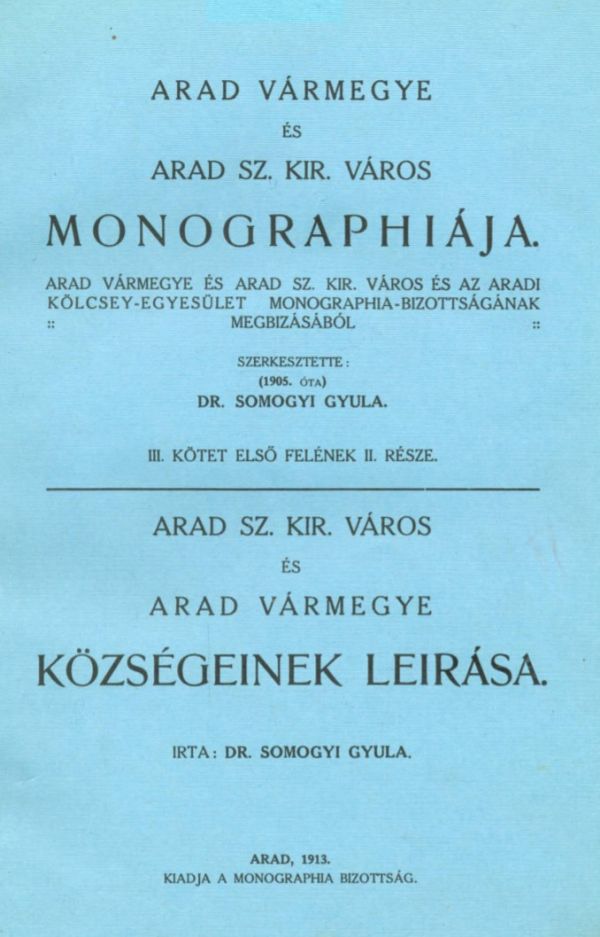 "Forrásaim voltak az Aradra és Arad megyére vonatkozó történeti művek éspedig Márki Sándor, Czucz, Fábián Gábor, Parecz István munkái. Főleg felhasználtam Fábián Gábor kéziratban levő művét: Arad Vármegye leirása historiai, geographiai és statistikai tekintetben, 1835., amelyet Márki Sándor nagylelkűen a Kölcsey Egyesületnek ajándékozott. Kiválóan használhattam, mint nagyon értékes forrásművet Márki Sándor Arad vármegye helységnévtára cimű három vaskos kötetű anyaggyűjteményét, melyet a kitűnő tudósnak történelmileg feldolgozni nem volt érkezése. Ezt a nagyon becses gyűjteményt az állam szerezte meg a Kölcsey-Egyesület részére. Használtam továbbá Pesty Frigyes Arad megyére vonatkozó 1857-iki gyüjtését. Végül magam is tüzetes kérdő-ívek útján két izben közvetlenül gyüjtöttem az adatokat. E részben nagy készséggel támogatott a vármegyei hatóság, kiváltképen Schill József főjegyző úr. Sok lappangó kézirat és kisebb füzet (Lejtényi: Aradi Kalauz, és mások) nagyon becses adatokat juttatott birtokomba. Különösen gazdag anyagot nyujtott azonban az aradi sajtó. A lekicsinyelt vidéki sajtó! Ki sejtené, hogy a vidéki lap mily üdvös szolgálatot tesz, a maga szűk körében, a komoly tudományosságnak, mily hasznos ammanuensise a buvárkodónak! Hálámat itt rovom le az aradi lapok szerkesztőségeinek azért, hogy mindenkor mindenben támogattak, rendelkezésemre bocsátva kiadványaik és lapjaik teljes gyüjteményét. Arad városa leirásánál Pécsi Ödön dr. tanár úr (történeti visszatekintés), Costa János tanár úr, városi közigazgatás, értelmiség, stb.) Tolnai János dr. (szinház és szinészet), dr. Schmidt János (turista egyesület) voltak szivesek adatokat rendelkezésemre bocsátani, melyeket nagyrészt szószerint használtam fel. Borosjenő leirásánál dr. Sorbán Kornél róm. kath plébános úr értékes kéziratai nagy szolgálatokat tettek nekem" írja Somogyi Gyula, a kötet előszavában.