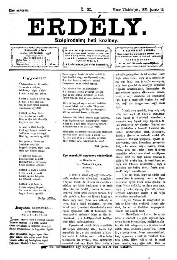 Marosvásárhelyen 1871 és 1876 között megjelent "szépirodalmi heti közlöny". Az első 13 lapszám szerkesztője Tolnai Lajos, később Balás Antal, majd Kerekes Sámuel.