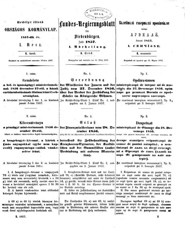 Erdélyi hivatalos értesítő a neoabszolutizmusban. Háromnyelvű: magyar, német, román.
