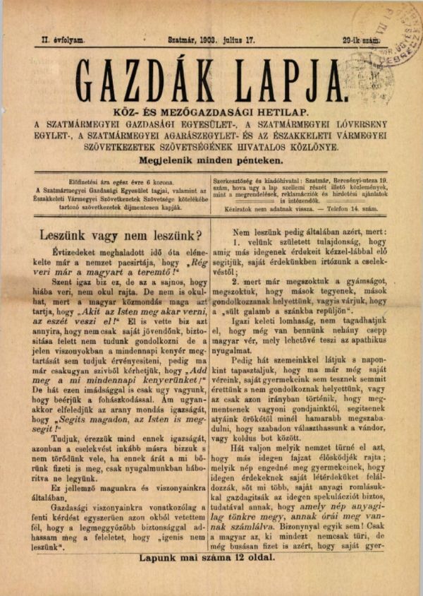 "Köz- és mezőgazdasági hetilap. A Szatmármegyei Gazdasagi Egyesület, a Szatmármegyei Lóverseny-Egylet, a Szatmármegyei Agarászegylet és az Éjszakkeleti Vármegyei Szövetkezetek Szövetségének hivatalos közlönye. Megjelenik minden pénteken. Alapította Poszvék Nándor, kiadótulajdonos és felelős szerkesztő 1901-ben, ki a lapot máig is szerkeszti. Főmunkatársai: Pethő György, a báró Vécsey-család jószágigazgatója, Bartha Kálmán városi gazdasági tanácsos és Soltész Miklós városgazda. Nemes András nyomása."