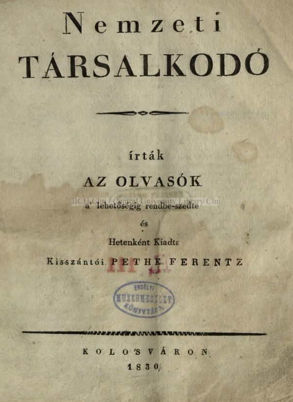 "[...] az Erdélyi Hiradó heti mellékleteként jelent meg a Nemzeti Társalkodó. Az első száma 1830. január 2-án jelent meg Pethe Ferencz szerkesztésében. Kezdetben a lap küzdött a nehézségekkel, de Pethe után, ki másfél éven át volt a lap szerkesztője, lassanként több tér jutott a szépirodalomra is s nemcsak a hasznos ismereteknek akart terjesztője lenni." muzsnai Ürmössy Lajos: Erdély irányadó lapja. Kolozsvár, 1907, 11. Forrás.