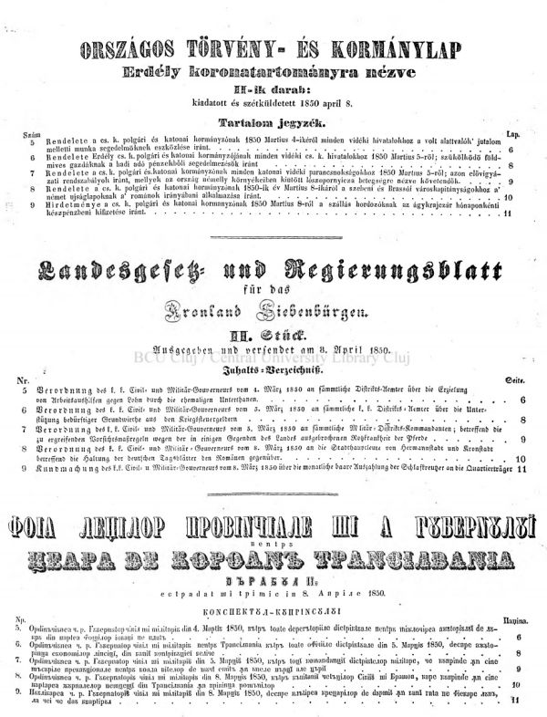 Erdélyre vonatkozó törvények, rendeletek, parancsok, "hirdetvények" a neoabszolutizmus korában, három nyelven (magyar, német, román).