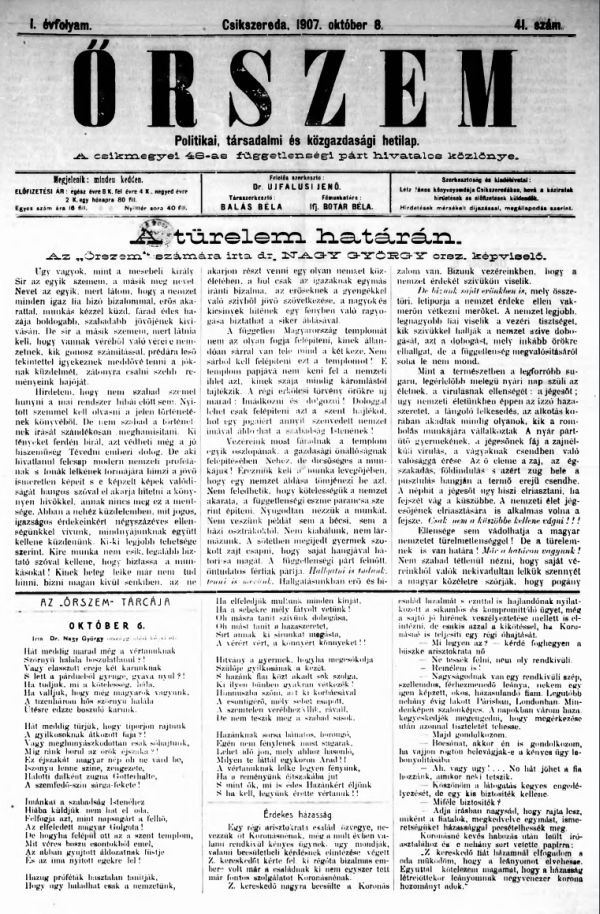 "Csíkszeredáról írják, hogy január hó 1-ével új függetlenségi és 48-as párti lap indul meg „Őrszem“ cimmel. Szerkesztője dr. Ujfalussy Jenő, csíkszeredai polgármester." - hozta a hírt 1904. január 5-én a Pesti Hírlap. Utolsó lapszáma 1909. január 5-én jelent meg - írja Nagy Benedek helytörténész a Van-e a napilapnak hagyománya Csíkban? c. rövid sajtótörténeti levelében. Forrás: Korunk, 1971/30. évf. 7. szám, 1119-1120.