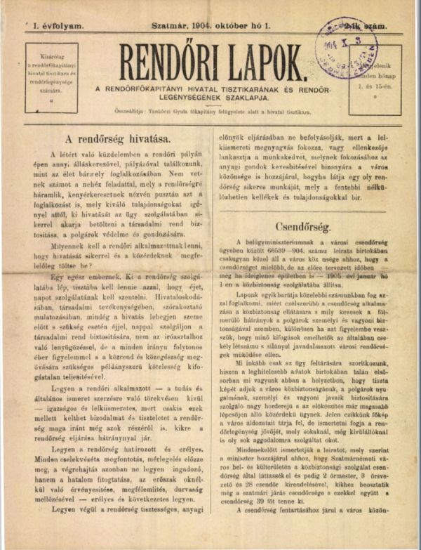 "A rendőrfőkapitányi hivatal tisztikarának, a rendőr- és csendőrlegénységnek szaklapja. Megjelent ezelőtt minden hó 1-én és 15-én; most minden hó elsején, kizárólag a kapitányi hivatal tisztikara, rendőr- és csendőrlegénysége számára. Összeállítja Tankóczi Gyula főkapitány felügyelete alatt, a hivatal tisztikara."