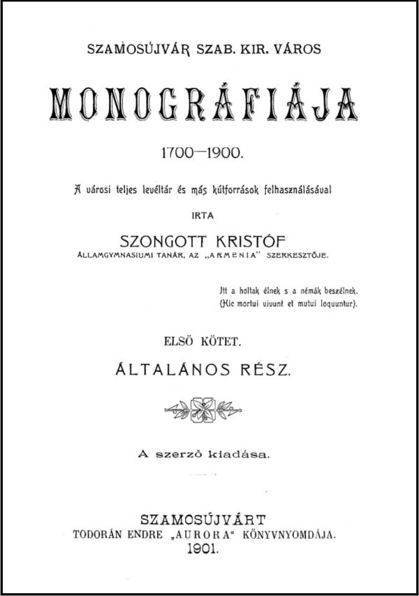 Szongott Kristóf (Maros-Bogát, 1843. márc. 21. – Szamosújvár, 1907. jan. 24.) "Atyját Szongott Jánosnak hívták, anyja Donovák Ripszima volt. Középiskoláit Gyulafehérvárt végezte 1863-ban kitűnő eredménynyel. Ekkor a Szamosújvár város közönsége által fentartott örm.kath. algimnáziumhoz tanárnak választották meg. A gimnázium államosítása alkalmával 1894-ben állami főgimnáziumi tanárnak neveztetvén ki, ebben a minőségben az 1903-ik évig szolgálta a tanügyet, amikor is 40 évi tanári működése után a közoktatásügyi kormány a saját kérésére nyugdíjaztatta. Tanári működése alatt városunk társadalmi és közéletében tevékeny szerepet vitt s igen eredményes működést fejtett ki, amelynek elismeréséül a városi polgárság bizalmából 1877-től kezdve egész a haláláig a város képviselőtestületének tagja volt. Tanári működése alatt a Számosújvárt szervezett képezdei póttanfolyamnak több éven át igazgatótanára volt; a szamosújvári ipariskolát hat éven át igazgatta. A Szt-István társulat tiszteletbeli tagjává, a magyarországi néprajzi társaság pedig az örmény osztály előadójává választotta meg. Sok éven keresztül a régi örm. kath. algimnázium képviseletében az erdélyi róm. kath. státusgyűlésnek is tagja volt." Szamosújvári Közlöny 1907. jan. 30. A szerzőről bővebben itt.
