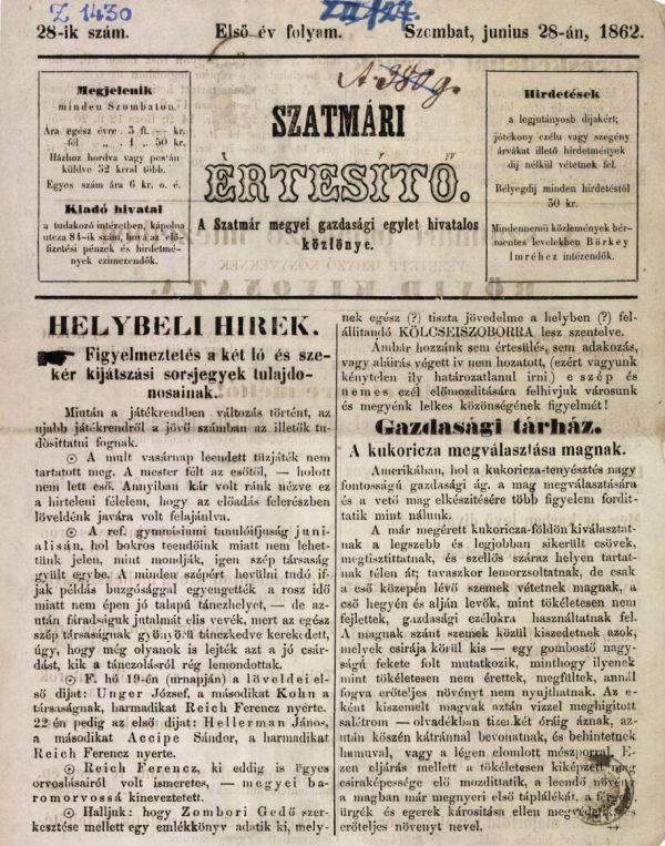 "A Szatmári Értesítőt (1861–1862) Ábrai Károly indította el 1861-ben, Börkey Imre felelős szerkesztésében és kiadásában. A nyomdai munkálatokat Debrecen város officinájában végezték. A hetenként megjelenő, a vegyes tartalmú és hirdetési lap határán álló orgánum fennmaradását biztosította, hogy a Szatmármegyei Gazdasági Egylet, a Nőegylet közlönye, a Nagy- és Felsőbányai, Nagy-Károlyi, Szinyér-Váraljai és a Fehérgyarmati Tudakozó Intézetek híradójaként is megjelenhetett. Ez gazdasági, kereskedelmi jelleget kölcsönzött a lapnak, ami Börkey biztosító ügynöki szemléletéből fakadhatott, de egy „tőkeerős” állandó előfizetői tábort is biztosított. Az olvasók az említett egyesületek munkájába, közéleti tevékenységébe is betekintést nyerhettek. A szerkesztők felhívást tettek közzé és ismertették a Szatmárban 1862-ben megrendezett nagyszabású gazdasági kiállítást. A pénzintézetek történetéhez nyújtott adalékot a felállítandó Szatmár megyei takarékpénztár alapszabályának tervezete. Ezek mellett csekély számban közérdeklődésre számot tartó cikkek is olvashatók, pl. Egy utazó szatmári látogatásainak tapasztalatai, vagy Börkey Imre tollából A cselédrendszer, az üzleti rendszer. Gyene Károly, akit 1865-ben Szatmár-németi jobboldali parlamenti képviselőjévé választottak, a SzatmárNémeti Felsőbb Protestáns Nőnövelde ügyében közzétett nyilatkozatában hozta az olvasók tudomására, hogy az alig egy hónapja nyílt intézetben az oktatást végző gimnáziumi tanárok fizetésére nem maradt anyagi fedezet, ezért mindannyian ingyen végezték munkájukat."