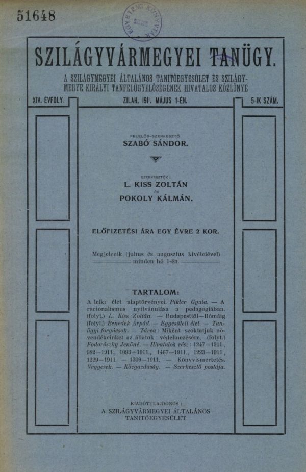A Szilágyvármegyei Ált. Tanítóegyesület és a Szilágyvármegyei Kir. Tanfelügyelőség hivatalos lapja. Megjelent a nyári hónapok kivételével havonként az első világháború előbb Zilahon, a második világháború idején Szilágysomlyón. 1918 és 1942 között szünetelt. Forrás. Bővebben.