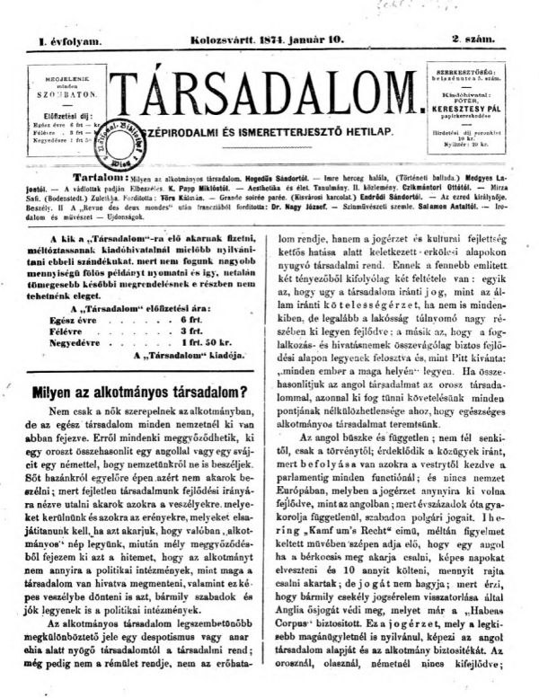 Az erdélyi viszonyokon kívül másik szerencsétlensége volt a szerkesztőnek, hogy a magyarországi írókra számított. Ezek nagyobbrészint túlságosan el vannak foglalva, kivéve a kapaszkodókat. S mi volt eredménye? Természetesen nem egyéb, mint hogy páron kívül ép ezek kapaszkodtak a Társadalomba. Gáspár Imre itt közölte életbölcseleti levelét kezdő íróinkhoz, itt közölte észrevételeit a „Bál-királynő dalai“-nak kritikáira, itt dalolt egész otthoniassággal, egész diadalittassággal; Ábrányi Emil itt zengett közel haláláról. S még ki nem?... Így a Társadalom szellemi ereje nem igen hódított; anyagi tőkéje kimerült, beállott a bukás. Pedig kár érte."