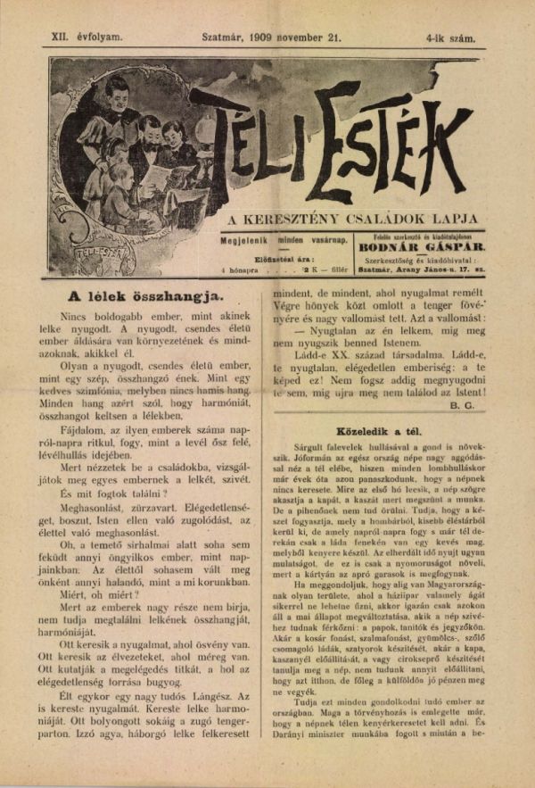 "A keresztény munkás és iparos családok számára Bodnár Gáspár indított Téli Esték (1887–1914) címen országos terjesztésre szánt orgánumot, amely novembertől februárig, négy hónapon keresztül látta el azokat vallásosan erkölcsös szellemű olvasnivalóval. A társasági lapnak tekinthető orgánum elindításában a szerkesztőt két tényező motiválta. Az egyik, az 1887-ben megjelent Téli Újság volt, ami Bodnár szerint valótlanságokat írt a katolikusokról, amire csak egy másik újsággal lehetett válaszolni. A másik okot a szocializmus eszméjének terjedése szolgáltatta, amelynek agitátorai főleg az iparos és polgári osztályban kerestek szövetségeseket. A szerkesztő újságja segítségével éppen ezért kereste az ő társaságukat. Később az agrárszocialista mozgalmak hatására a földműveseket sem hagyta figyelmen kívül, sőt azok számára külön lapot is szerkesztett. A szépirodalom (sokszor itt jelentek meg először a szerkesztő legújabb elbeszélései) mellett közegészség, gazdák világa, mi újság (hírek a világból, az országból), háziasszony rovatcímek alatt olvashattak praktikus tanácsokat a lap olvasói."