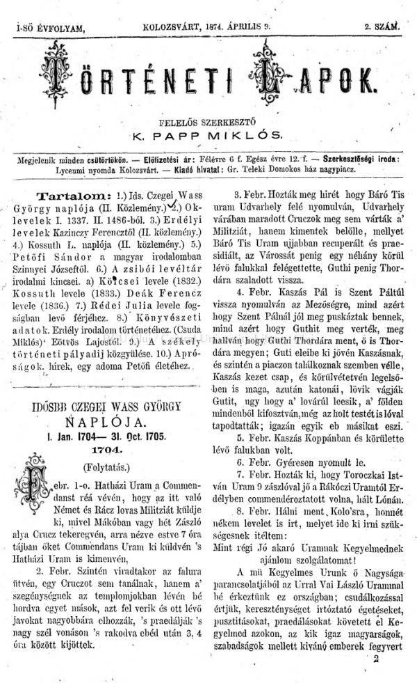 Hernádi László Mihály: A Történeti Lapok repertóriuma 1874–1876. Bevezetés. Budapest, 1983. Forrás.